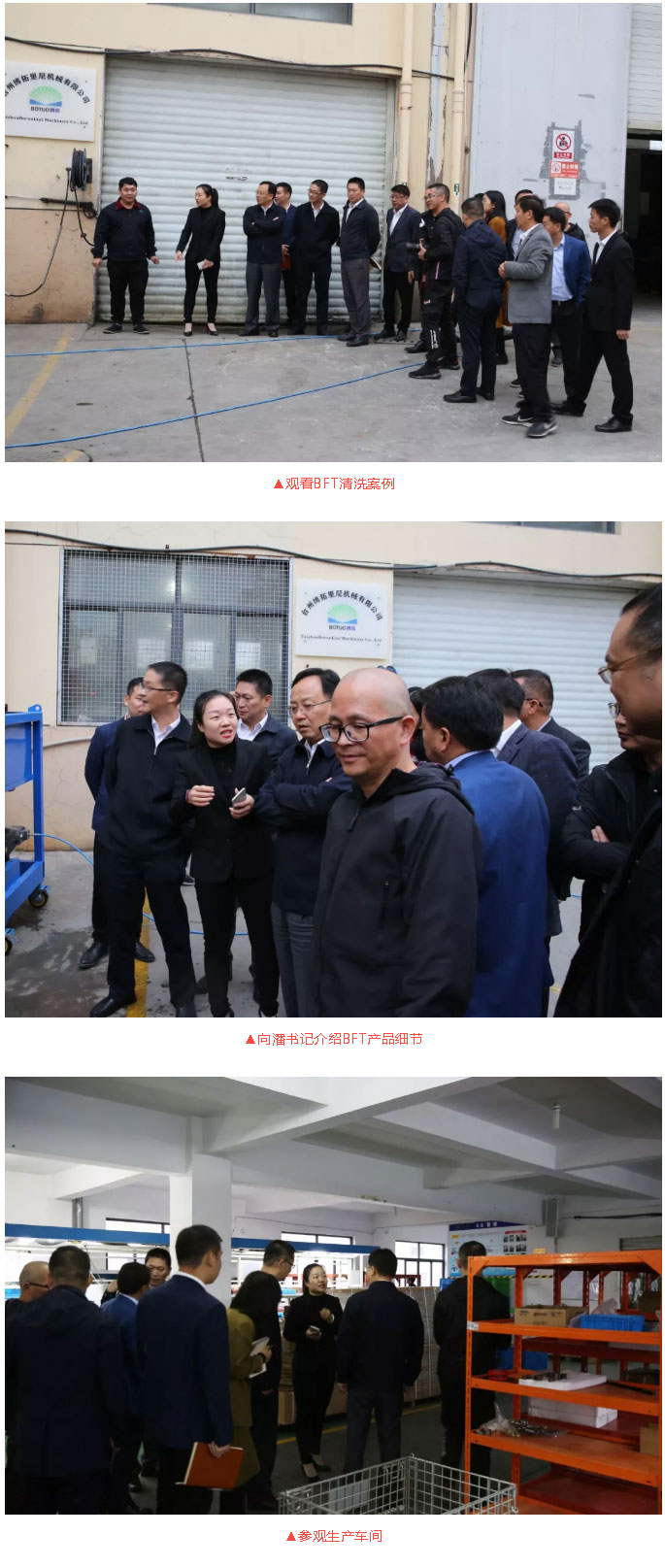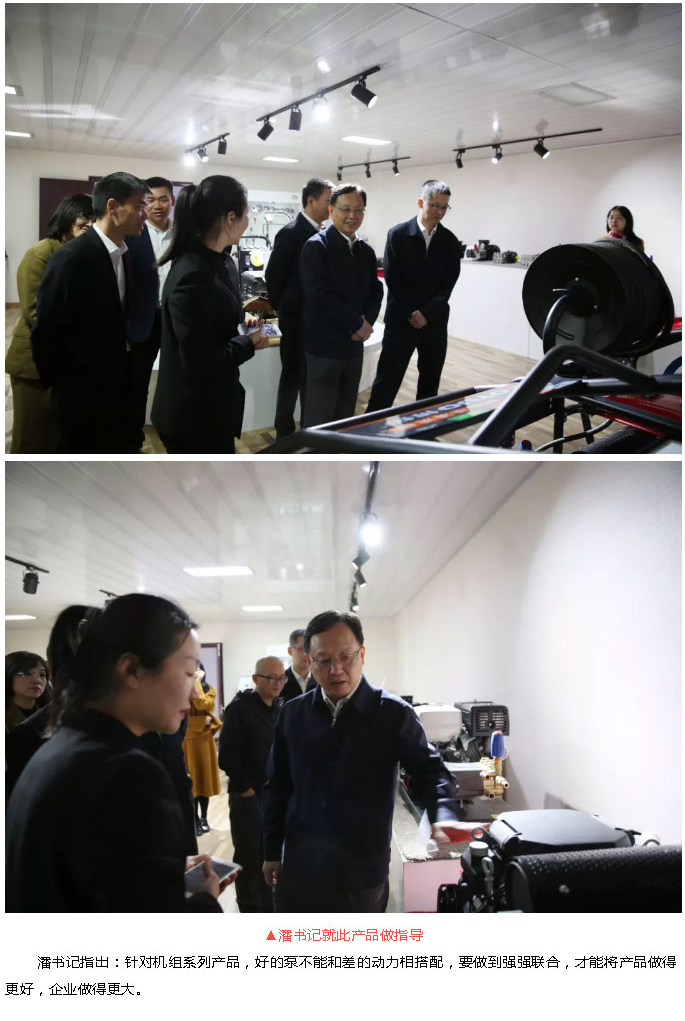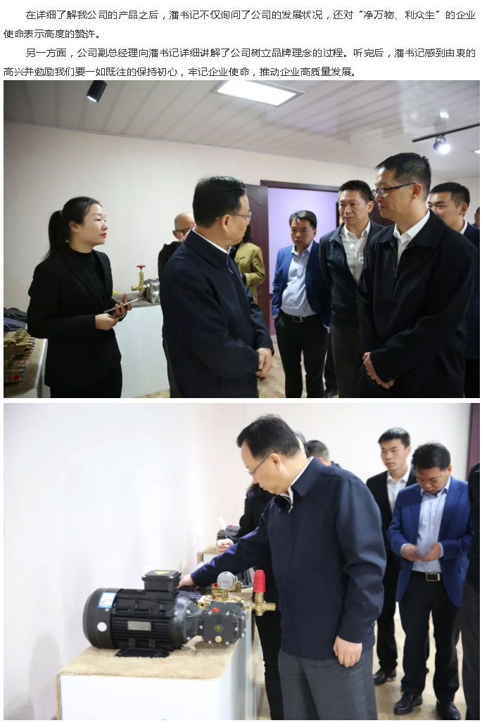 期間,潘書記等一行領導首先觀看我司新產品BFT1500公斤機組的清洗案例,在進一步了解清洗機組結構構造和使用范圍后,還參觀走訪了精加工車間、生產裝配車間和調試車間了解柱塞泵生產過程以及到展廳參觀產品。